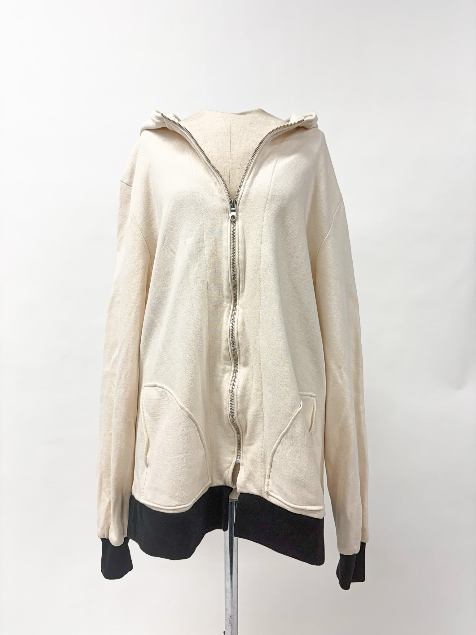 ほんのりコーヒー染めを施したジップアップフーディ。オフホワイトに近い柔らかな色合いに深みを加え、袖口と裾にはブラックリブを合わせたツートンカラーです。ジップアップ仕様で着脱しやすく、季節を問わず幅広く着用できます。