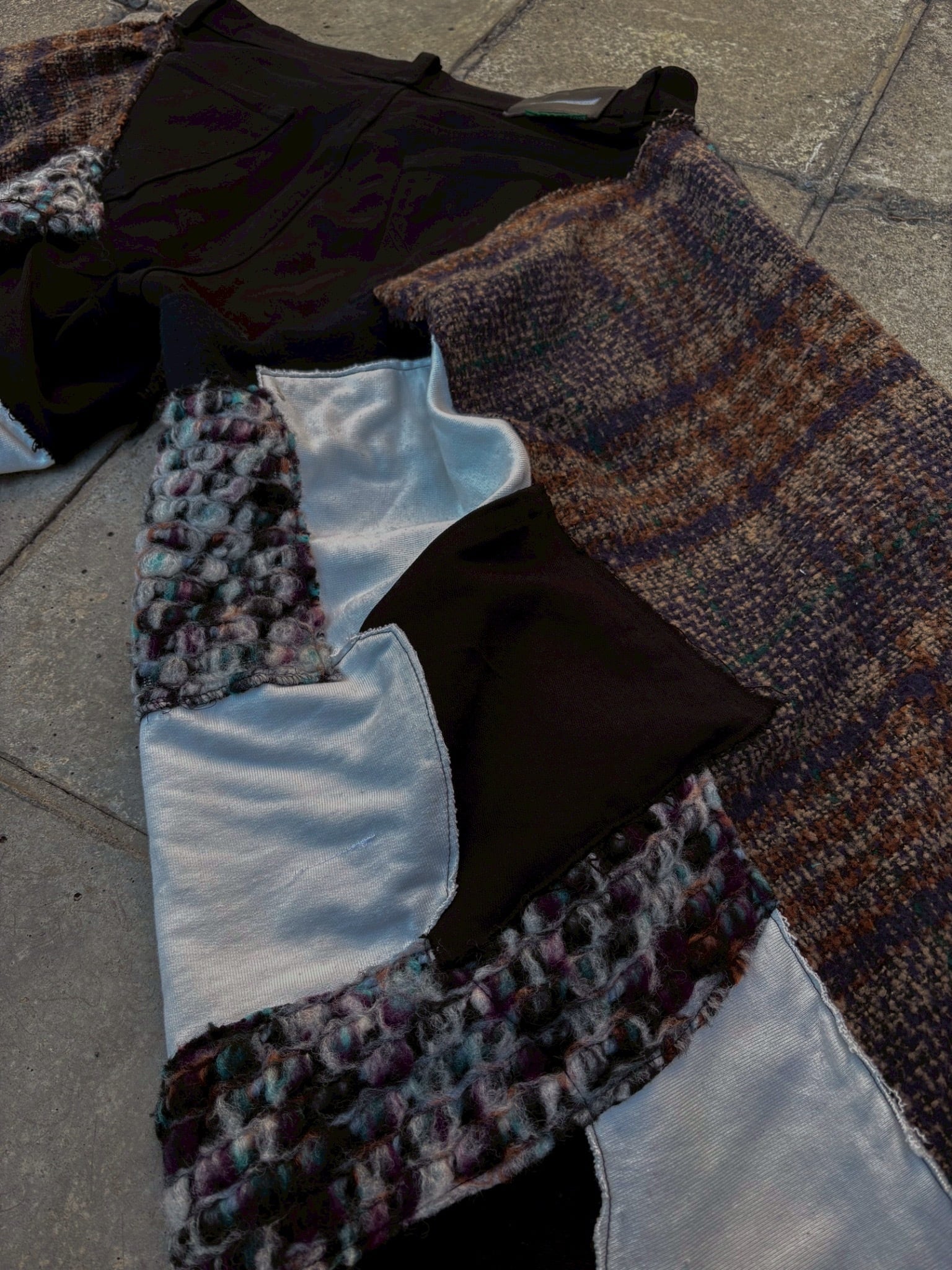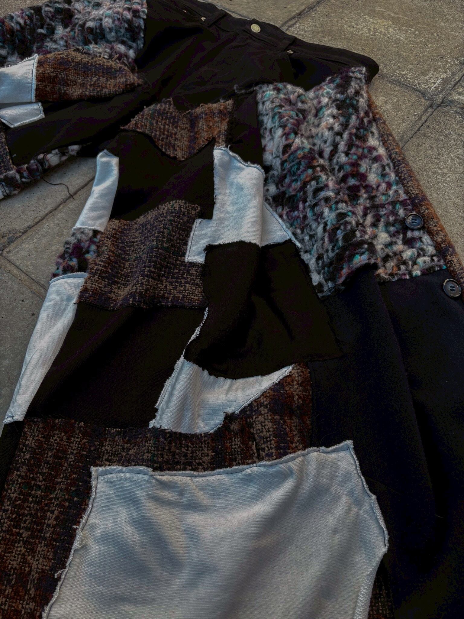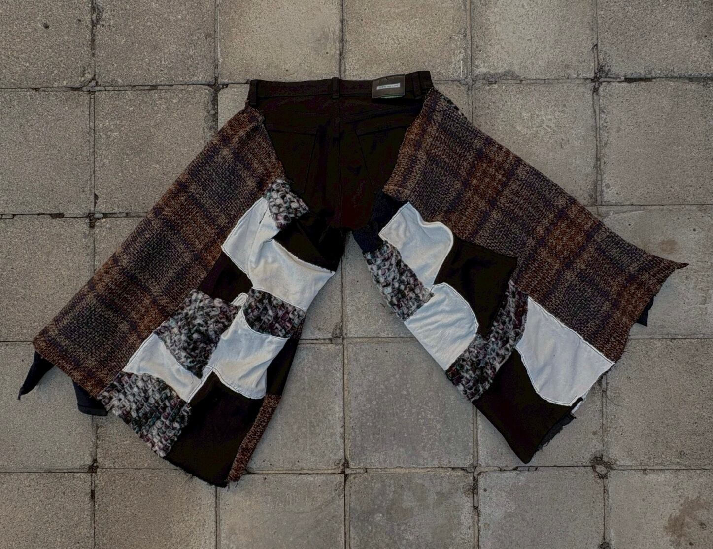 黒デニムをベースに、ベルト部分と前開き部分のみを残し、下半分かほぼ全てパッチワークで