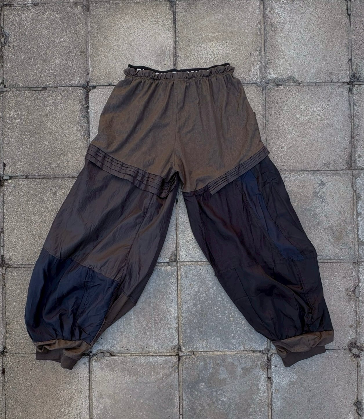 膝上から切り替えを入れ、下半分は複数の裏地をパッチワークのように縫い合わせて